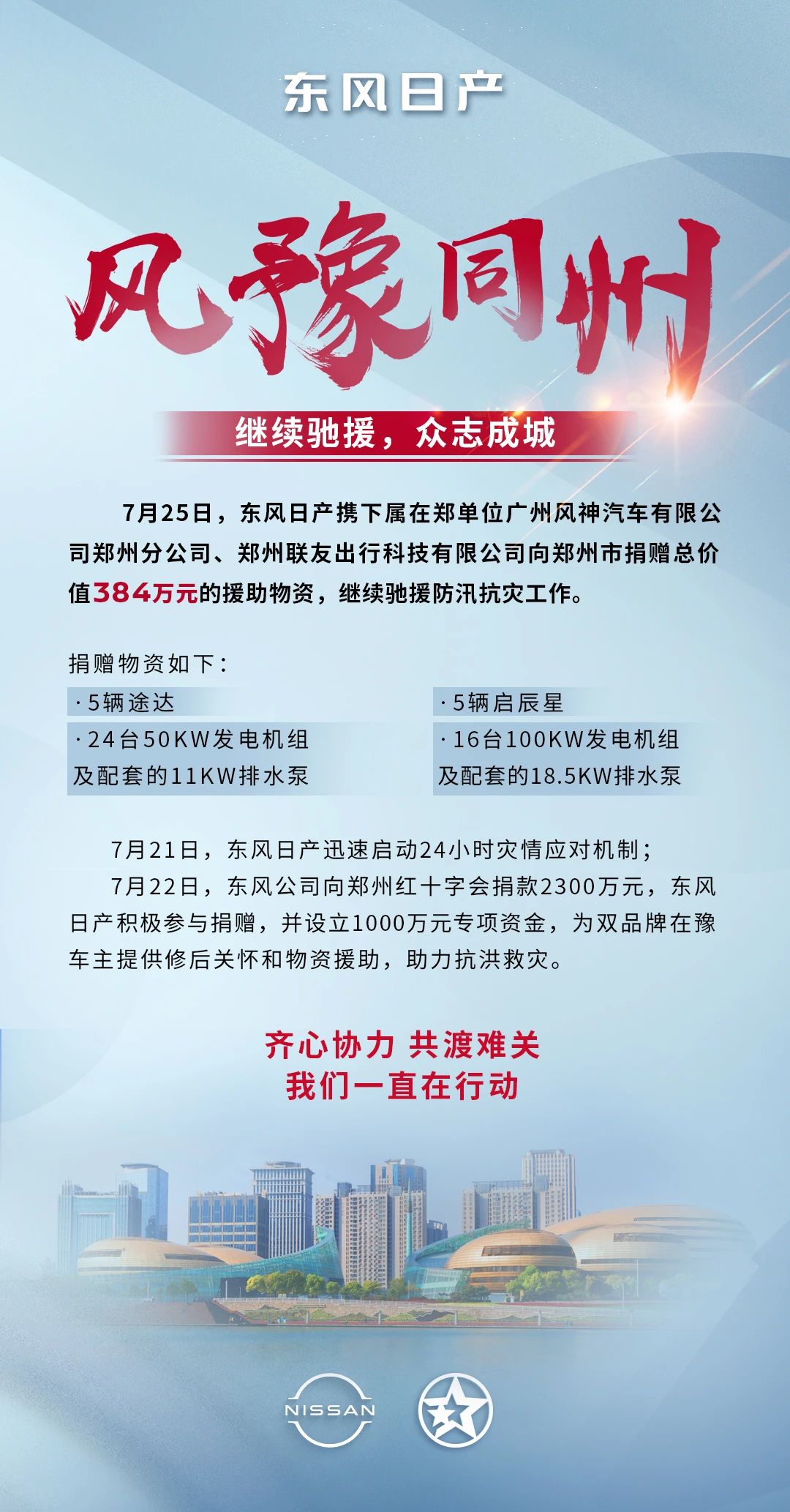 继续驰援,众志成城,东风日产向郑州市捐赠价值384万救援物资