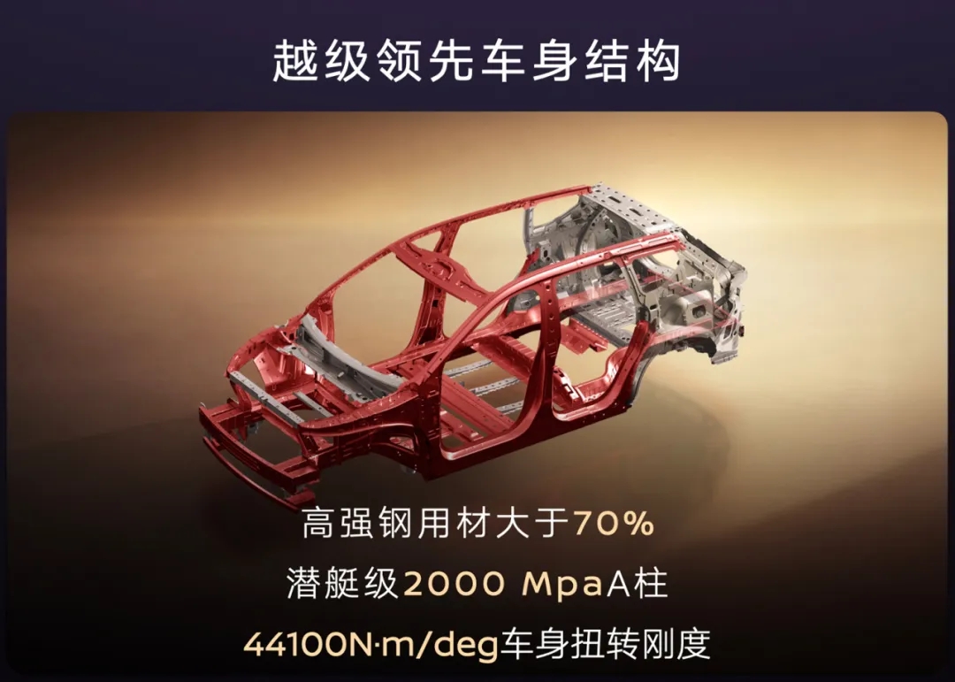 ·车身结构上,A柱采用2000兆帕潜艇级钢材,全车高强钢用量超70%;