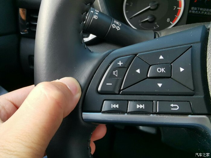 方向盘的造型还是比较经典的,皮革包覆包裹着,手感不错